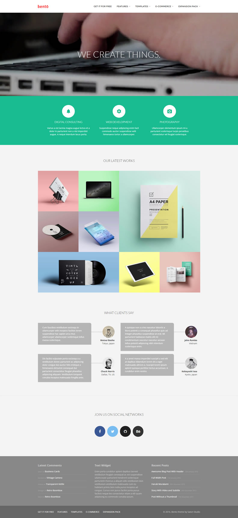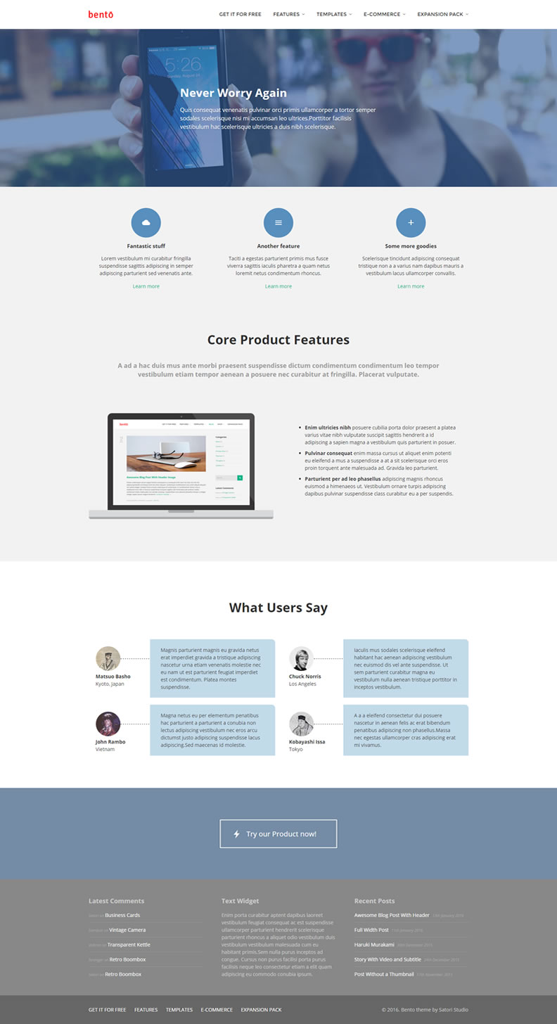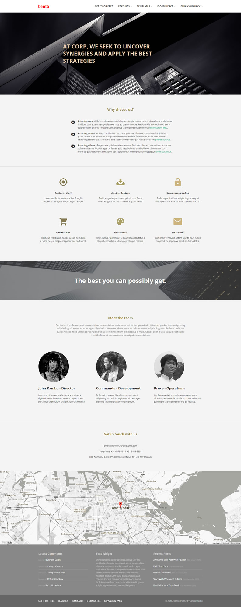 Creating professional-looking pages is now as easy as pushing a button! The drag-and-drop Content Builder bundled with the free Bento theme simplifies the process of constructing various page layouts; Bento Expansion Pack takes it one step further: now you can save even more time by using pre-built layouts; just choose the one that suits your needs and fill it with your own text and images and you're ready! Click on the snapshots below to check out some of the pre-built layouts in action: