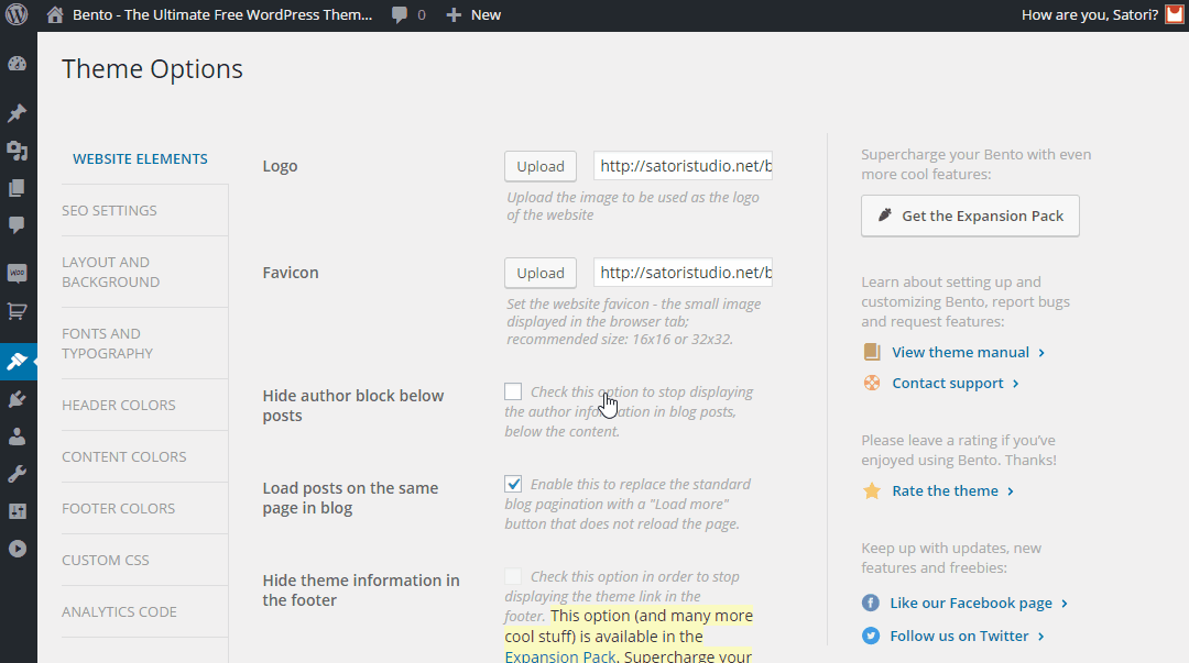 Bento comes with a set of powerful customization options, packaged nicely into an unbranded Theme Options panel, found under the "Appearance" admin menu. It contains 100+ settings to customize the look and feel of your website, from such general items as page background and fonts, to SEO settings, Google Analytics setup, and unlimited color choice for every individual element of the website. Try it yourself - download the official free copy of Bento here.